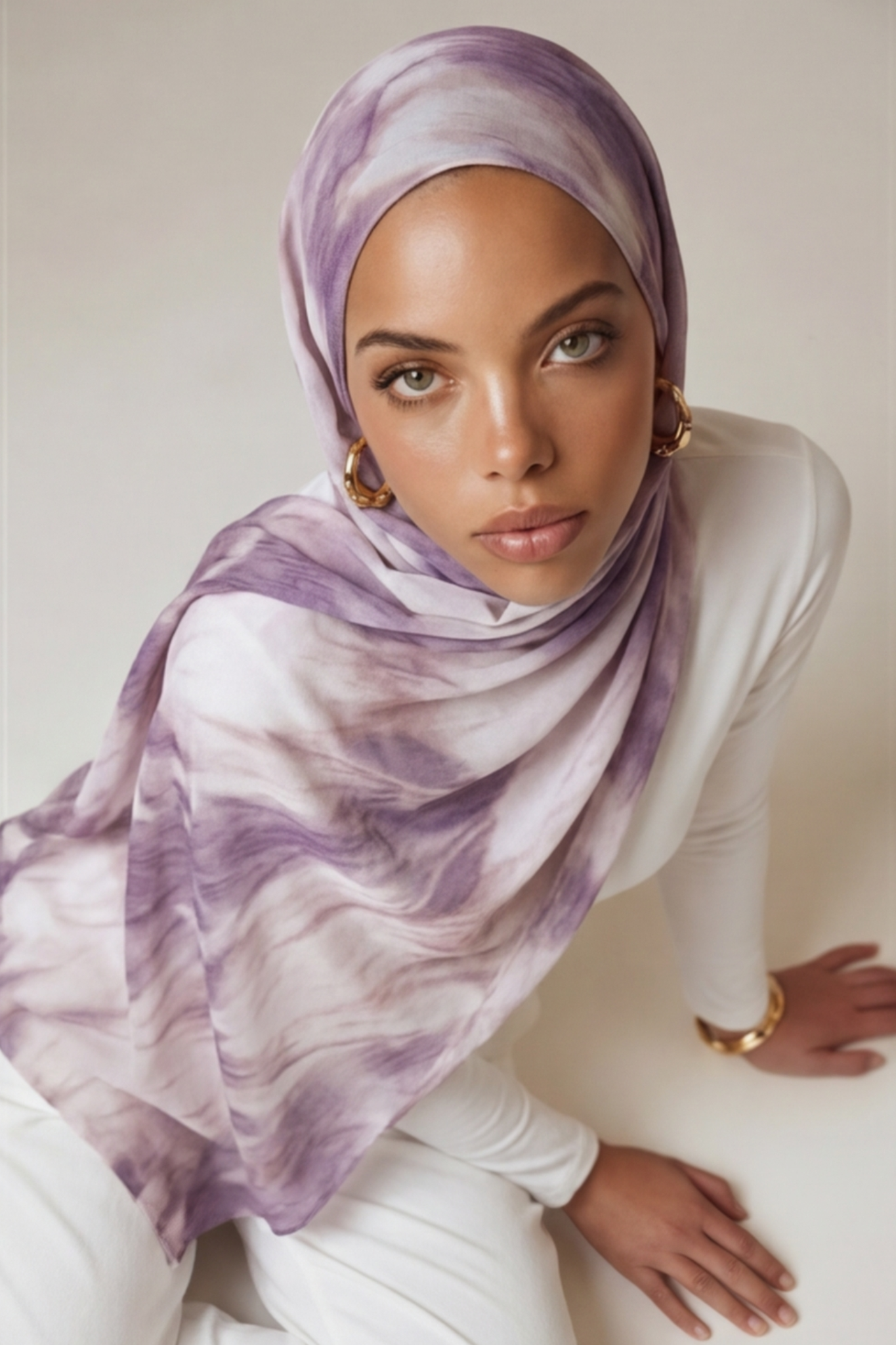 This stunning hijab showcases a delicate watercolor-inspired print that blends soothing shades of lavender, mauve, blush, and creamy ivory. The design evokes a sense of elegance and tranquility, with its softly blended strokes creating a dreamy, artistic effect. The lightweight fabric flows effortlessly, ensuring a comfortable and graceful drape, ideal for both everyday wear and special occasions. The harmonious mix of colors and abstract patterns makes this hijab a versatile statement piece, adding a touch of sophistication to any ensemble while celebrating modern femininity with a timeless charm.